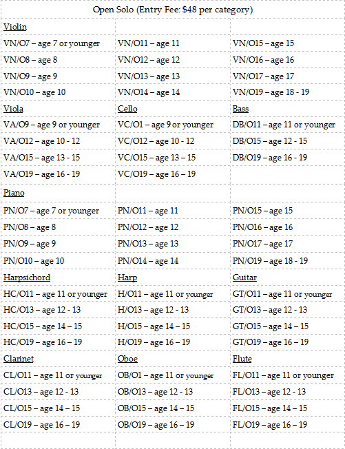 For students performing works of a serious competitive nature. The best four performers in each category will win a commemorative medal. Performance consists of one piece or movement, accompanied or unaccompanied, not to exceed 5 minutes. Any baroque and early classical period composers. For Clarinet any transcript music can be used. Please arrive 15 minutes prior to your scheduled performance. Make sure to register at the front desk and fill out the comment sheets with your contest info and repertoire for judges to use. You may sign up other two Prodigy and Open categories. Contestant who sign up these categories may not sign up with any of the Qualified categories.