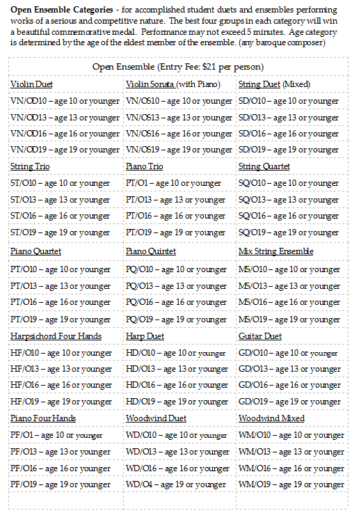 For accomplished student duets and ensembles performing works of a serious and competitive nature. The best four groups in each category will win a beautiful commemorative medal. Performance may not exceed 5 minutes. Age category is determined by the age of the eldest member of the ensemble. Any baroque and early classical period composers. For Clarinet any transcript music can be used. Please arrive 15 minutes prior to your scheduled performance. Make sure to register at the front desk and fill out the comment sheets with your contest info and repertoire for judges to use. You may sign up other two Prodigy and Open categories. Contestant who sign up these categories may not sign up with any of the Qualified categories.