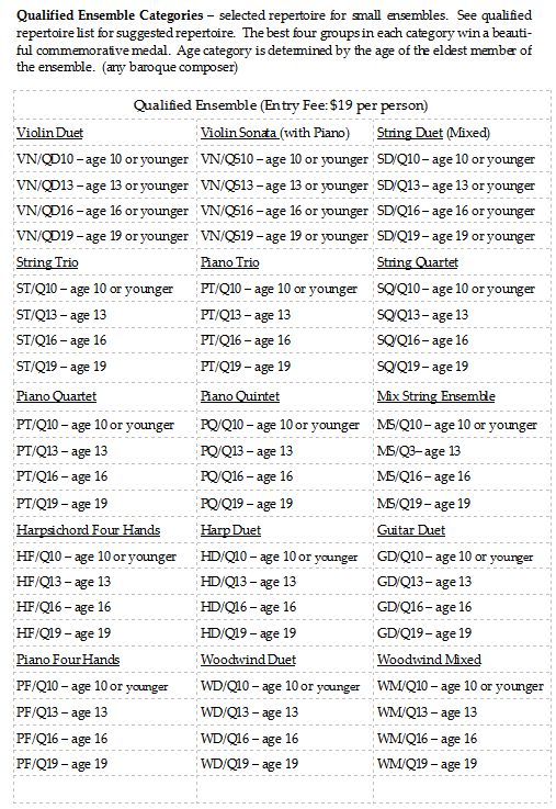 selected repertoire for small ensembles. See qualified repertoire list for suggested repertoire. The best four groups in each category win a beautiful commemorative medal. Age category is determined by the age of the eldest member of the ensemble. (Any baroque and early classical period composers) For Clarinet any transcript music can be used. Please arrive 15 minutes prior to your scheduled performance. Make sure to register at the front desk and fill out the comment sheets with your contest info and repertoire for judges to use. You may sign up other two Qualified categories. Contestant who sign up these categories may not sign up with any of the Prodigy and Open categories.